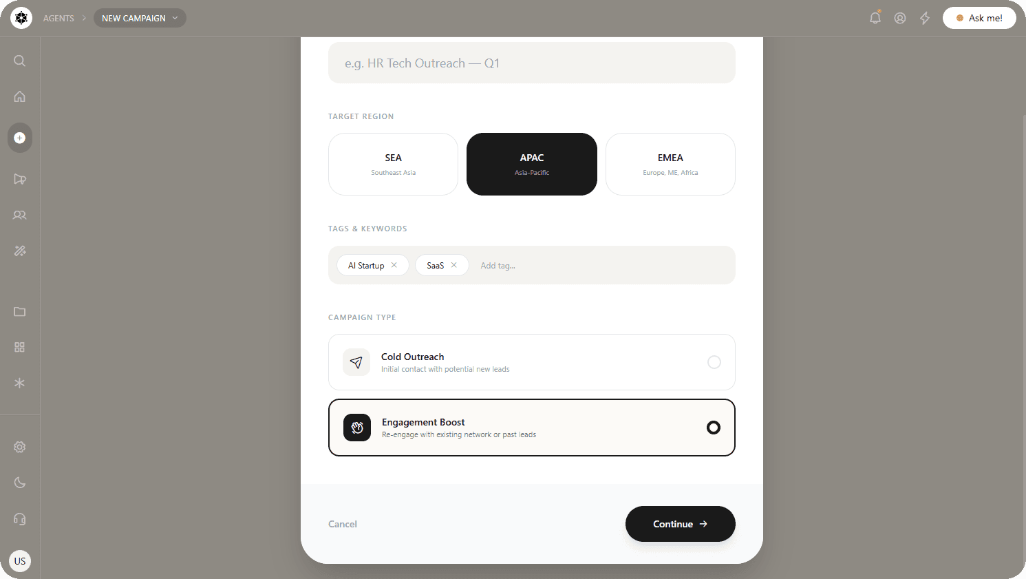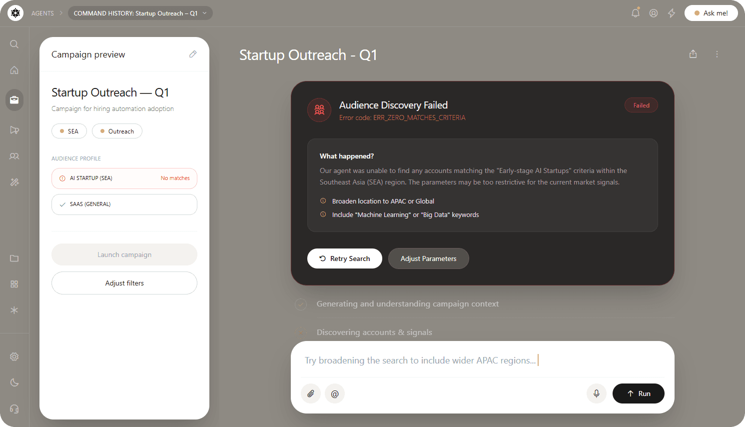 Once set up, the AI agent takes over, transforming inputs into a structured, executable campaign that keeps every step visible and editable from one workspace.