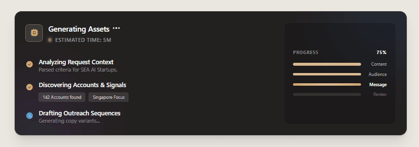 Growth teams spend hours manually researching accounts, crafting messages, and stitching together multi step campaigns across disconnected tools. The process is repetitive, slow, and riddled with context switching leaving little room for strategy or creative thinking.