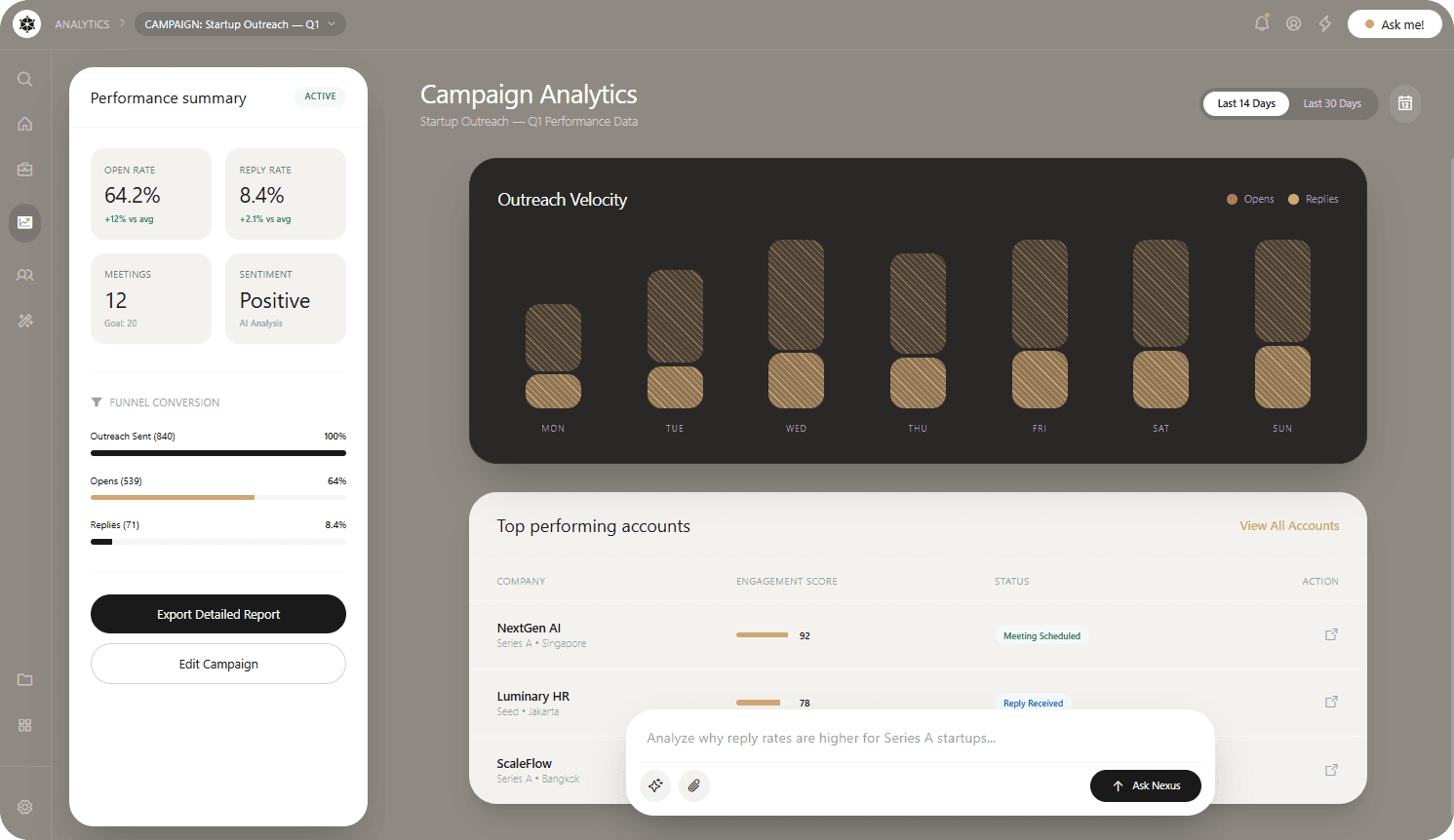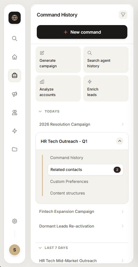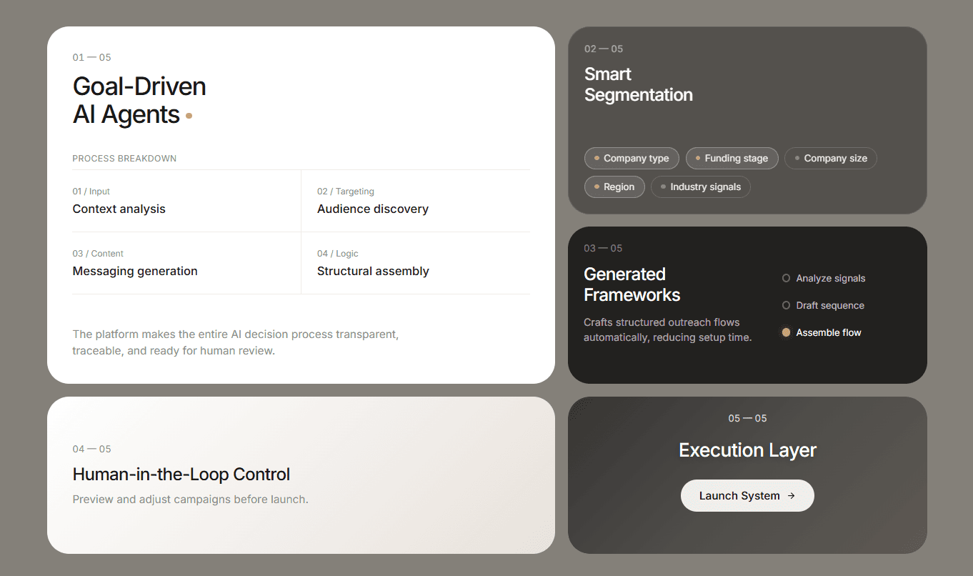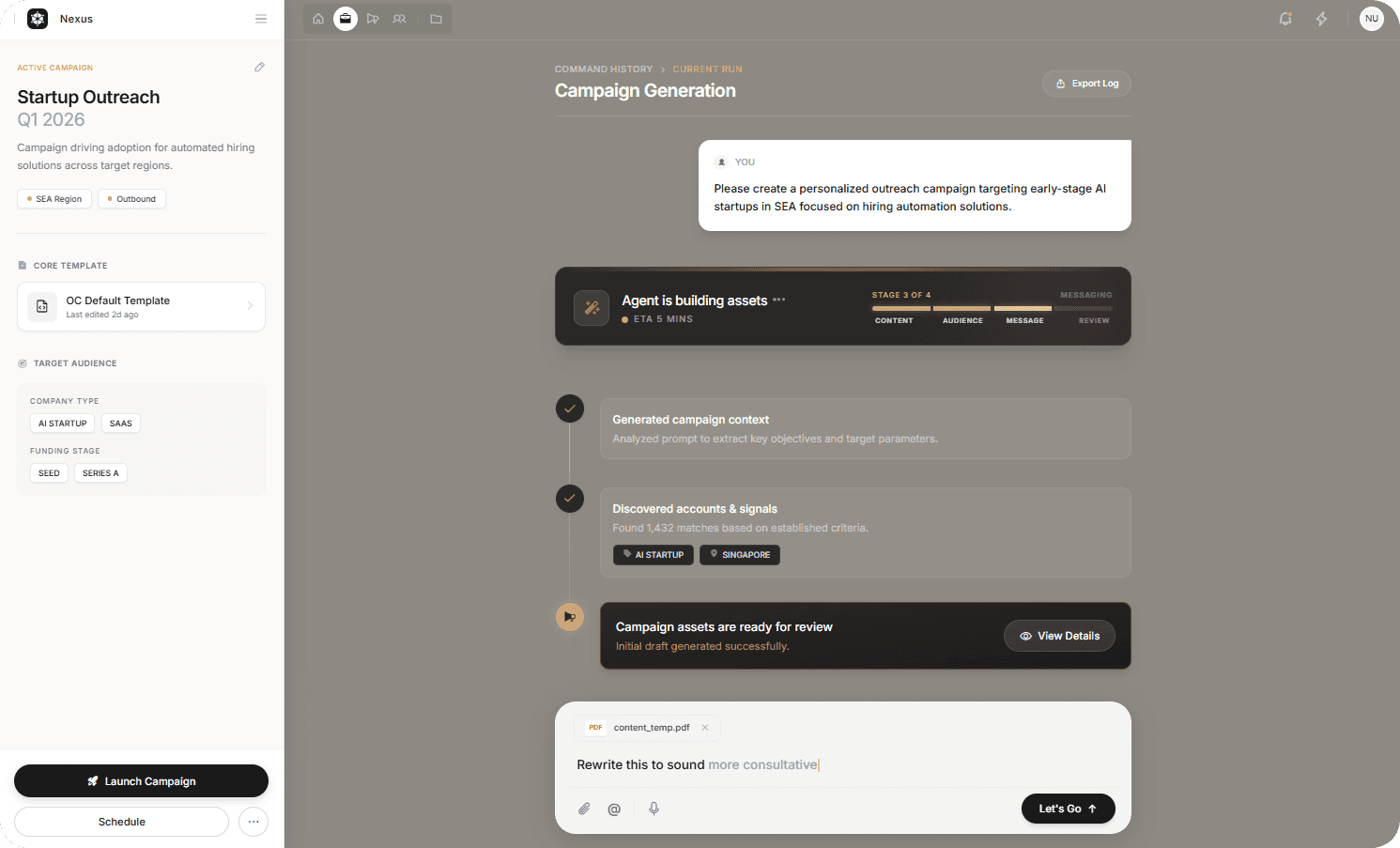 Nexus puts AI agents at the center of the workflow. Users define an objective and the platform handles the heavy lifting from analyzing signals and identifying prospects to drafting sequences and assembling campaigns. Everything stays transparent, editable and under human control, so teams move faster without losing oversight.
